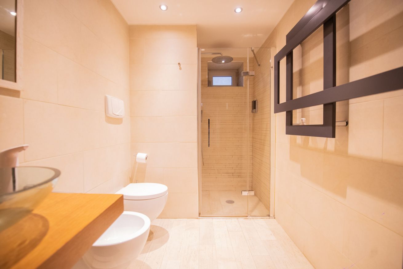 Un bagno moderno e raffinato, progettato per il massimo comfort e provvisto di ogni servizio necessario. L’ampia doccia con pareti in vetro e soffione a pioggia offre un’esperienza rilassante e rigenerante. Il lavabo in vetro su un piano in legno dona un tocco di eleganza contemporanea, mentre i sanitari sospesi garantiscono un design minimal e funzionale. Gli ospiti troveranno tutto l’occorrente per il loro soggiorno, dal sapone agli asciugamani di qualità, doccia shampoo, carta igienica e tanto altro. L’illuminazione calda e i toni neutri delle pareti completano un ambiente intimo e accogliente.