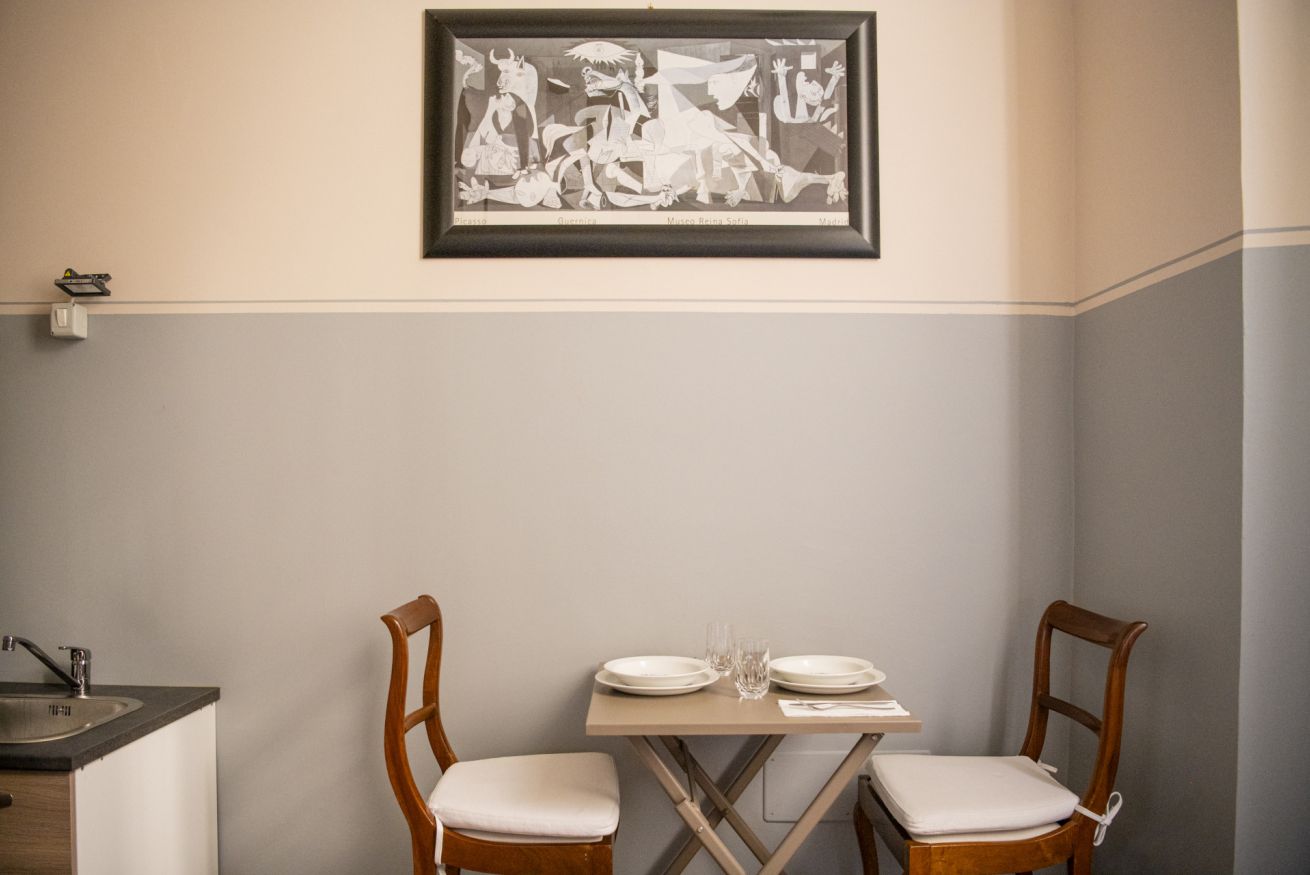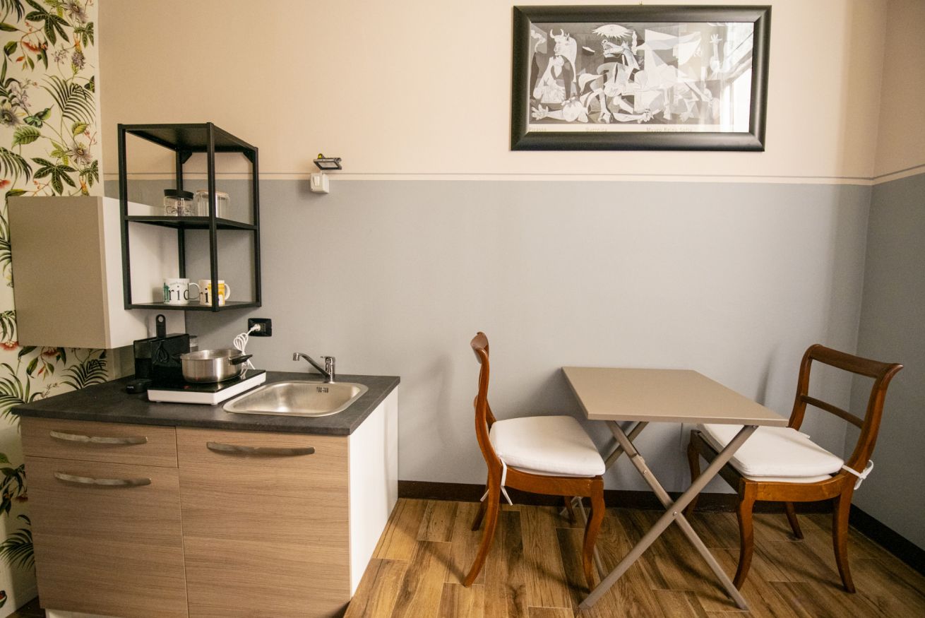 Appena varcata la porta d’ingresso, sarai accolto da un pratico cucinino attrezzato, perfetto per preparare una colazione veloce o una cena intima.