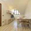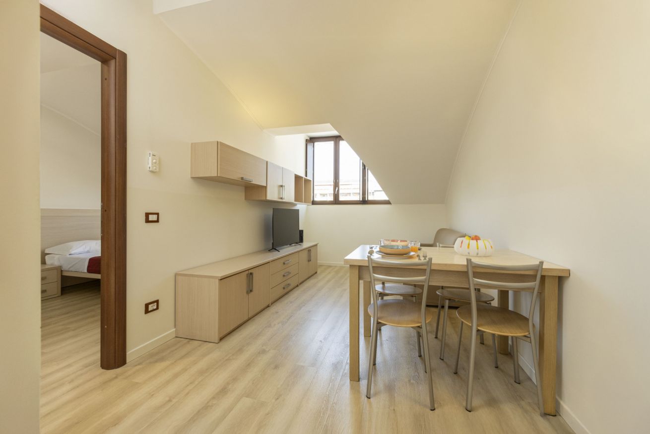 Il soggiorno è pensato per accoglierti dopo una giornata intensa tra arte, shopping e lavoro. Un comodo divano, la parete attrezzata con TV a schermo piatto e arredi in legno chiaro creano un ambiente rilassante e familiare. È lo spazio ideale per sorseggiare un bicchiere di vino prima di cena o per rilassarti con un film dopo aver vissuto Milano al massimo.