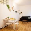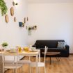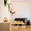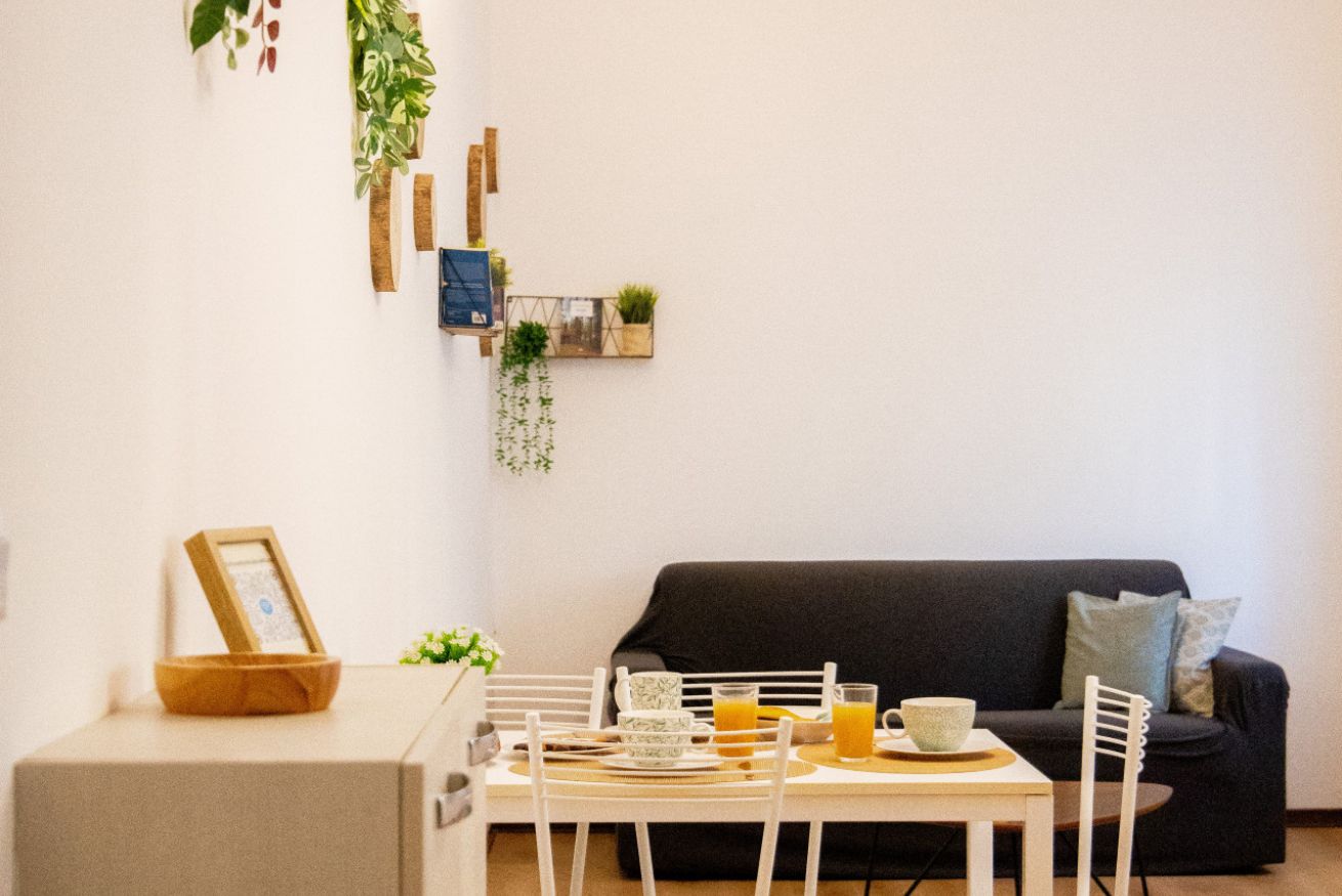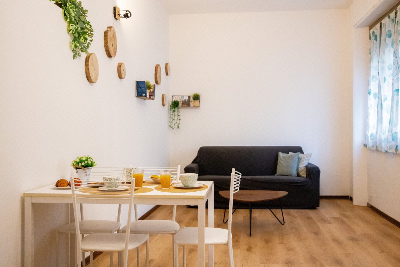 L’appartamento si apre su una zona living ampia e pulita, organizzata per adattarsi ai diversi ritmi della giornata. Il divano offre uno spazio confortevole per rilassarsi, mentre il tavolo da pranzo funziona bene sia per mangiare sia per lavorare. La luce naturale entra in modo uniforme, creando un ambiente chiaro e piacevole da vivere.