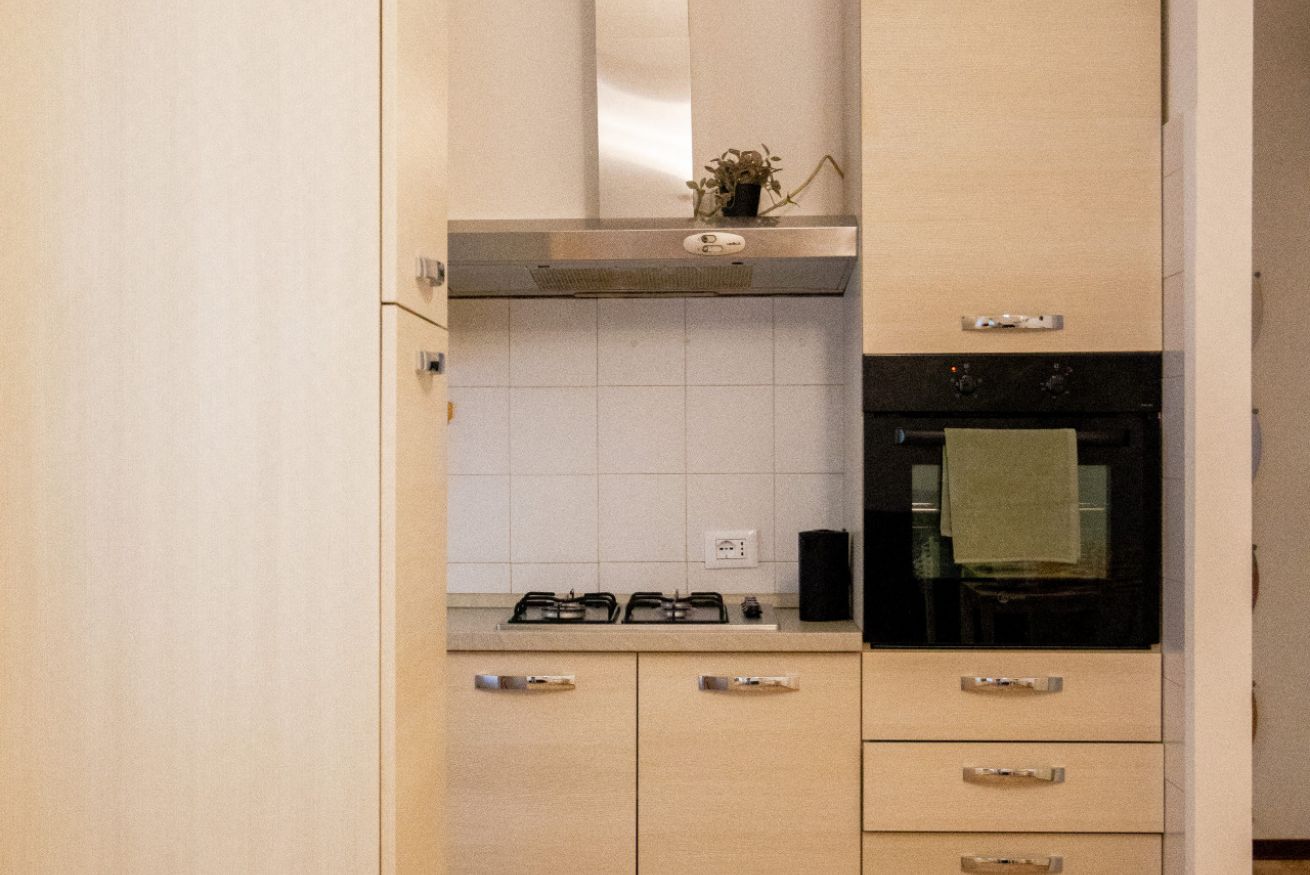 La cucina, integrata nella stessa area, è pratica e immediata: piano cottura, forno, frigorifero e le dotazioni essenziali permettono di preparare pasti senza complicazioni, mantenendo tutto in ordine grazie alla disposizione semplice degli spazi.