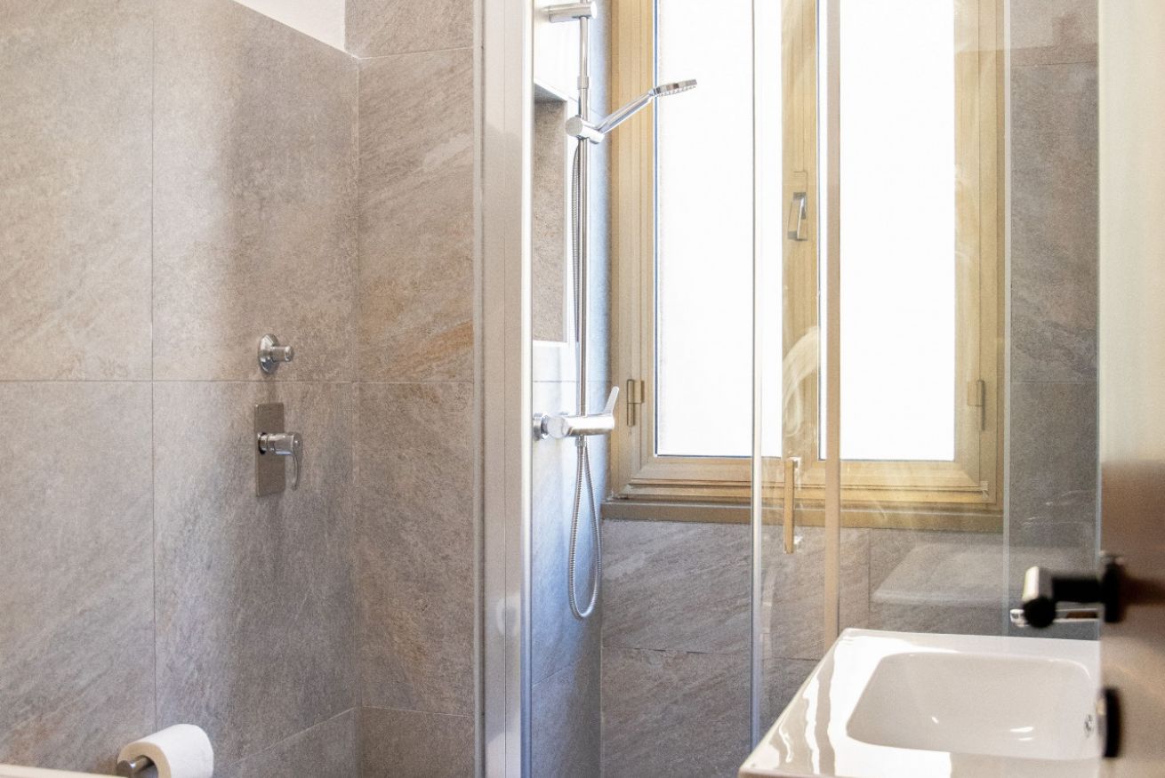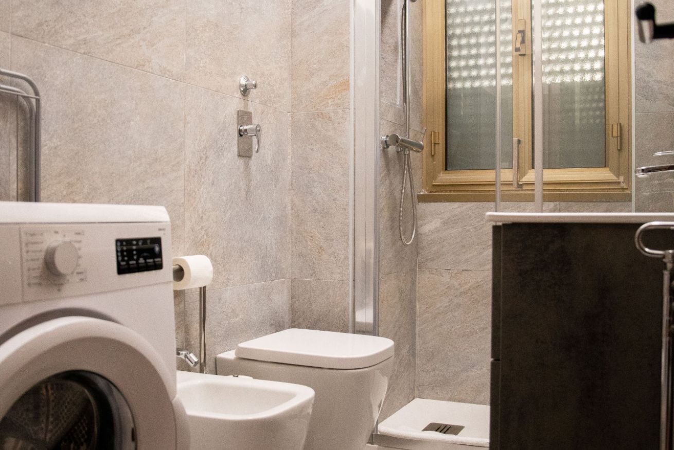Il bagno, ristrutturato e di facile utilizzo, ospita una doccia moderna, bidet e lavatrice, rendendo agevoli anche i soggiorni prolungati. Le superfici neutre e lineari mantengono l’ambiente ordinato e intuitivo.