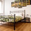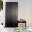 La camera da letto matrimoniale è pensata per favorire quiete e privacy, con arredi essenziali, un letto solido e luminose aperture verso l’esterno. La palette naturale e i dettagli grafici creano un’atmosfera rilassante e coerente con lo stile contemporaneo dell’appartamento.